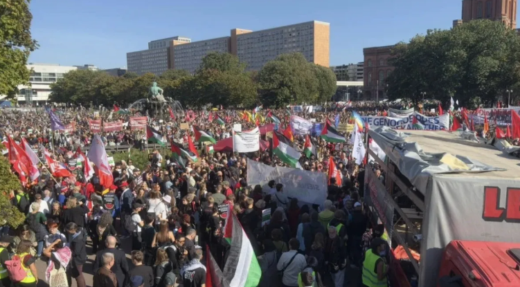 Cumartesi günü Almanya'nın başkenti Berlin'de 100 bini aşkın kişi Filistin'e destek için yürüdü.