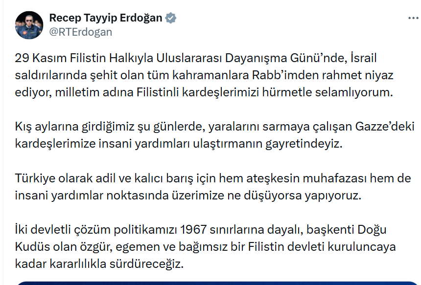 Cumhurbaşkanı Recep Tayyip Erdoğan, 29 Kasım Filistin Halkıyla Uluslararası Dayanışma Günü dolayısıyla yaptığı paylaşımda, İsrail saldırılarında hayatını kaybeden Filistinli tüm kahramanlara rahmet dileyerek Gazze halkına destek mesajı verdi.