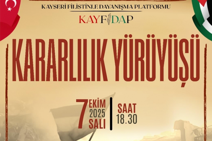 Kayseri – Kayseri Filistinle Dayanışma Platformu (KAYFIDAP), İsrail’in Filistin’de gerçekleştirdiği saldırılara karşı farkındalık oluşturmak ve dayanışmayı artırmak amacıyla "Kararlılık Yürüyüşü" düzenliyor. Yürüyüş, 7 Ekim 2025 Salı günü saat 18.30’da başlayacak.